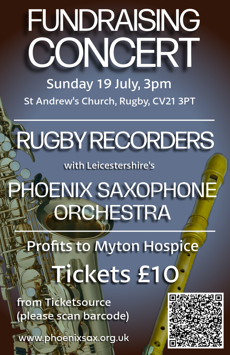 The concert will feature separate ensemble pieces from Rugby Recorders and Phoenix, plus a joint piece – Viadana’s Sinfonia ‘La Bergamasca’ – and the world premiere performance of Steve Marshall’s ‘Concertino’, a concerto for recorders and solo soprano saxophone, to be performed by Samuel Beddard.